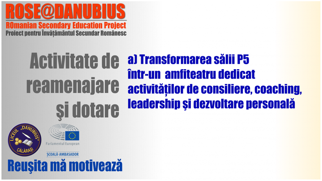 Transformarea sălii P5 în amfiteatru, prin lucrări de igienizare, înălțare în trepte, compartimentare – viitorul forum de dezbatere între partenerii în educație (Liceul Danubius; reprezentanți ai comunității; membri ai comitetului de părinți pe școală; părinți; poliție; reprezentanți ai mediului de afaceri – Camera de Comerț, Industrie și Agricultură, patronate; Poliție etc.), spațiul intim de realizare a activităților de consiliere, îndrumare și orientare profesională, activități de remediere, pregătire specială. Activitățile se vor desfășura pe toată durata proiectului, exceptând perioadele în care se efectuează lucrările de amenajare.