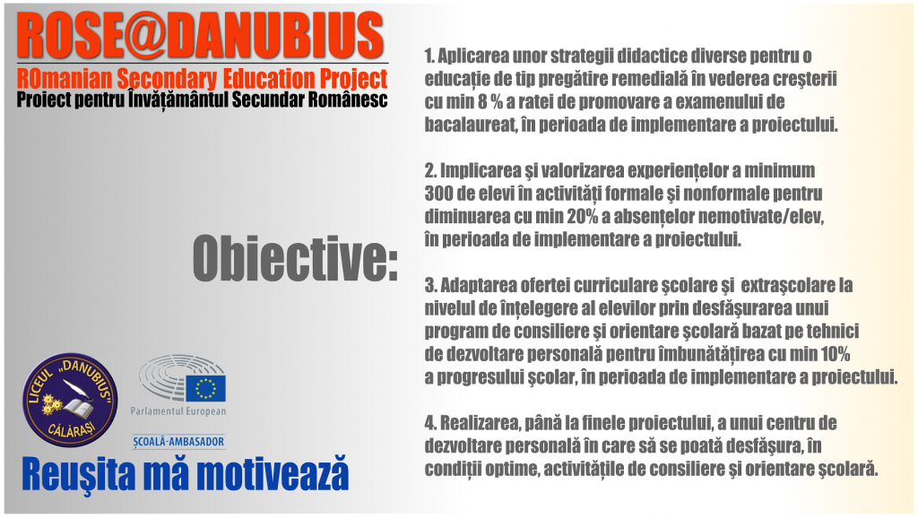 PROIECTUL PRIVIND ÎNVĂȚĂMÂNTUL SECUNDAR – ROSE este un proiect care își propune să contribuie la reducerea abandonului în învățământul secundar și terțiar și la creșterea ratei de promovare a examenului de bacalaureat.