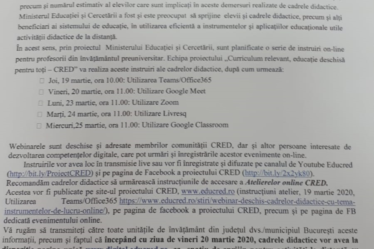 Orarul unității școlare va fi respectat pentru întâlnirile sincrone dintre profesori și elevi. Întâlnirile sincrone vor fi organizate prin aplicatiile Meet sau Zoom, la decizia profesorilor, urmand a fi comunicate elevilor.