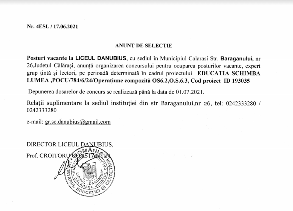 Anunț selecție – Educația schimbă lumea