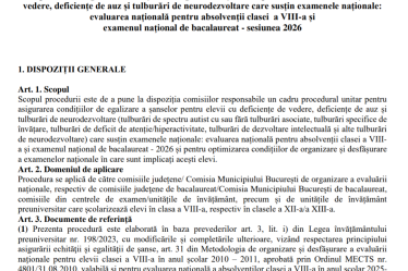 Bacalaureat Evaluarea naționalăPROCEDURĂcu privire la asigurarea condițiilor de egalizare a șanselor pentru elevii cu deficiențe de vedere, deficiențe de auz și tulburări de neurodezvoltare care susțin examenele naționale: evaluarea națională pentru absolvenții clasei a VIII-a și examenul național de bacalaureat – sesiunea 2026