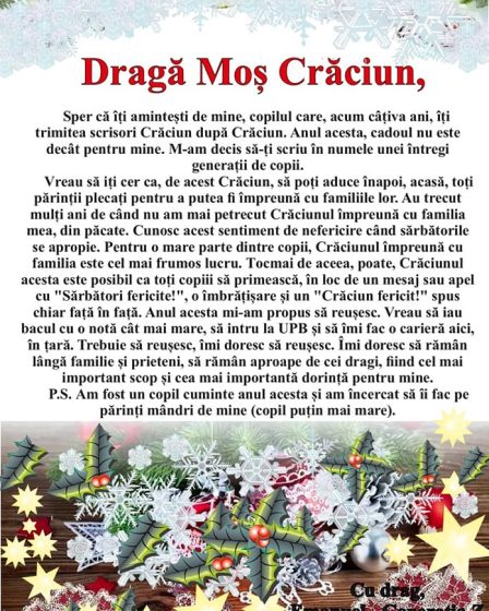 Astăzi, am finalizat, cu succes, proiectul transdisciplinar (Tehnoredactare, Design al produselor multimedia și Limba română), în cadrul căruia am urmărit: grafica, designul, coerența și coeziunea textului, dar, mai ales, autenticitatea și curajul de a transmite un mesaj lui Moș Crăciun și nu doar lui. Vrem ca mesajul transmis de elevi să ajungă cât mai departe …