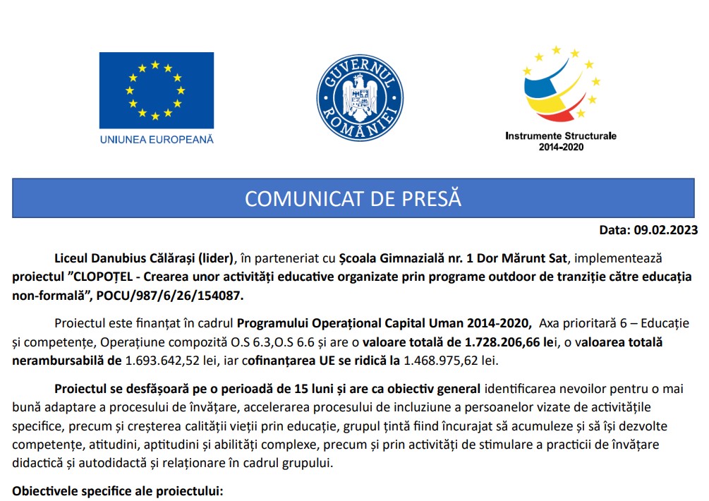 Prima pagină Proiecte scolare Proiecte europene Clopoțel Comunicat de presă – Proiectul „Clopoțel” POCU/987/6/26/154087