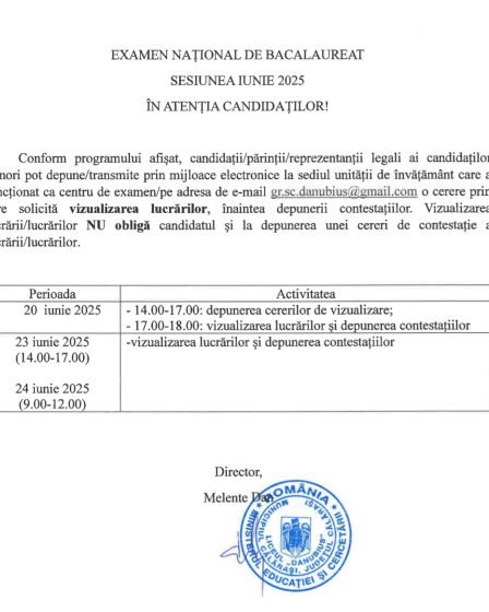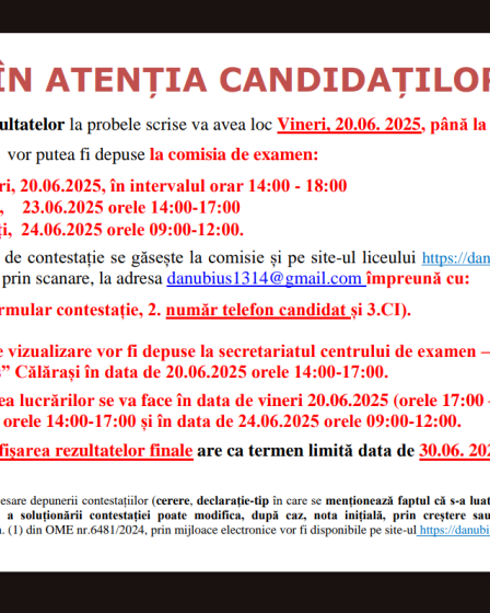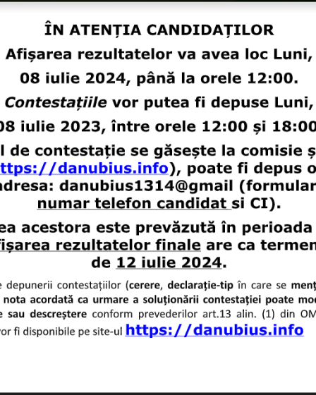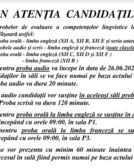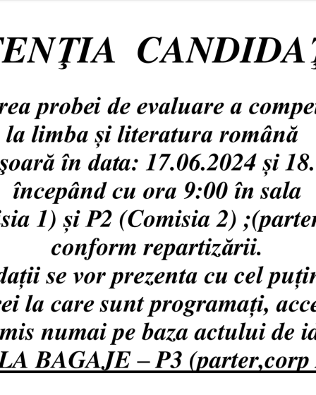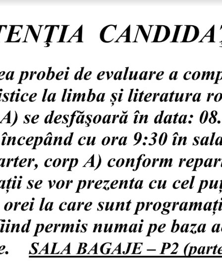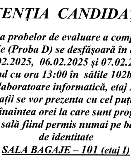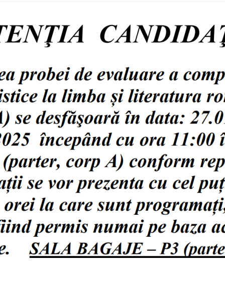 Susţinerea probei de evaluare a competențelor lingvistice la limba și literatura română (Proba A) se desfăşoară în data: 27.01.2025 și 28.01.2025 începând cu ora 11:00 în sălile P1 și P2 (parter, corp A) conform repartizării. Candidații se vor prezenta cu cel puțin o oră înaintea orei la care sunt programați, accesul în sală fiind permis …