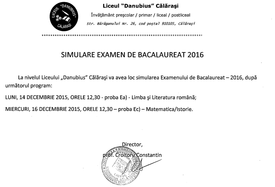 Aducem la cunostinta tuturor candidaţilor înscrişi la examenul de bacalaureat, sesiunea august-septembrie 2012, urmatoarele informatii: 1. S-a constituit un CENTRU DE INFORMARE, în care candidaţii să aibă acces la subiectele din sesiunile anterioare, manuale, ghiduri de pregătire, internet, etc..Informaţii suplimentare aflaţi la Secretariatul liceului „Danubius”. 2. S-au afisat online documentele transmise de Centrul National de Evaluare si …