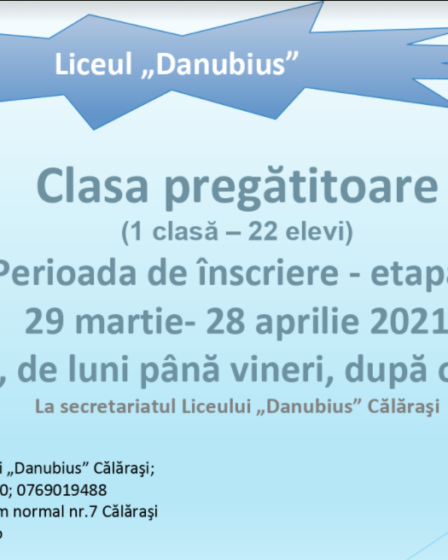 Liceul Danubius își propune să înființeze o clasă pregătitoare pentru elevii călărășeni. Străzile arondate Liceului „Danubius” Str. Parcului, Str. Policlinicii, Str. Bărăganului, Aleea Constructorului – bl J11, J12, J13, J14, J15, J16, J18, J21, J22, J23, J24, J25, J26, J27, J28, J29, J.30, J31; Str, Ştirbei Voda – J1 – J10; Str. Muşeţelului – K17,K18; …