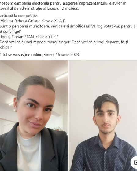 Vineri, 16 iunie 2023, s-a organizat scrutinul pentru alegerea reprezentantului elevilor în Consiliul de administrație al Liceului Danubius.Au candidat elevii: Sloganuri de campanie „Sunt o persoană muncitoare, verticală și ambițioasă! Vă rog votați-mă, pentru a vă convinge!” Violeta-Rebeca Onișor „Dacă vrei să ajungi repede, mergi singur! Dacă vrei să ajungi departe, fă-ți echipă!” – Ionuț-Florian …