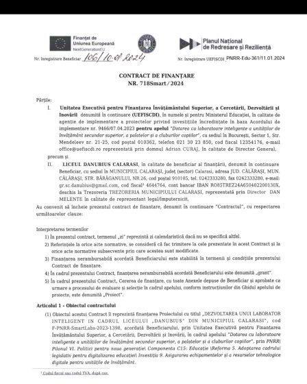 Încă o reușită pentru Liceul Danubius Călărași… Am semnat contractul de finanțare pentru înființarea unui SmartLab în cadrul liceului nostru, prin intermediul unui proiect pe fonduri UE, depus și câștigat. Spațiul este deja pregătit! Elevii și profesorii noștri se vor bucura de echipamente IT de ultimă generație care vor îmbunătăți și facilita învățarea. #Danubius#the_best#fonduri_europene#PNRR