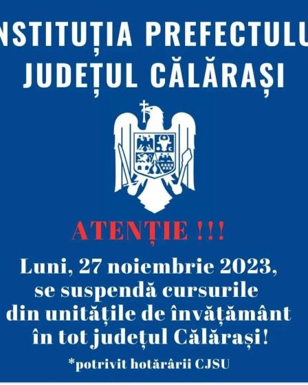 În ședința CJSU de duminică, 26 noiembrie 2023, s-a luat decizia de a se suspenda cursurile in toate unitățile de învățământ din judetul Călărași pentru data de 27 noiembrie 2023. Conform art. 9, alin. 6 din ROFUIP, suspendarea cursurilor este urmată de măsuri privind parcurgerea integrală a programei școlare prin modalități alternative stabilite de consiliul …