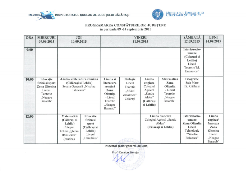 CATRE UNITATILE DE INVATAMANT DIN JUDETUL CALARASI In atentia conducerii unitatilor de invatamant Va rugam sa informati cadrele didactice despre consfatuirile organizate pe discipline astfel: Matematica – 13.09.2012, ora 10,00 – Colegiul Agricol Sandu Aldea Calarasi – Zona Calarasi – 14.09.2012 ora 10,00 – Liceul Teoretic Neagoe Basarab – Zona Oltenita Biologie – 13.09.2012, …