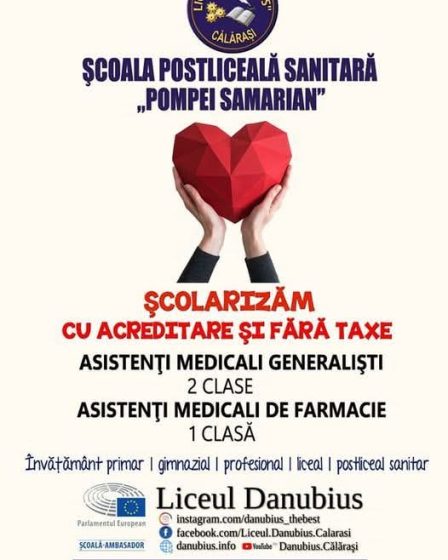 #Start înscrieri an școlar 2025-2026- Școala Postliceală Sanitară.Școala Postliceală Sanitară „Pompei Samarian” din cadrul Liceului Danubius Călărași vă așteaptă pentru înscrieri la specializările Asistent Medical Generalist (2 clase, 56 locuri-buget) și Asistent Medical de Farmacie (1 clasă, 28 locuri-buget)-calificări acreditate, cursuri fără taxă, diplome recunoscute în țară și străinătate. Se pot înscrie absolvenți de liceu …