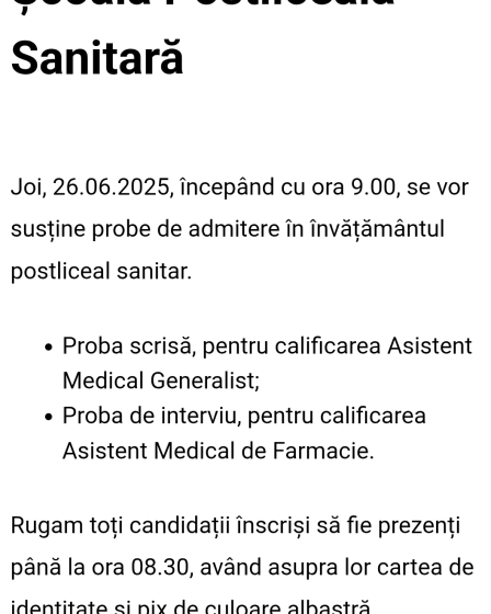 Joi, 26.06.2025, începând cu ora 9.00, se vor susține probe de admitere în învățământul postliceal sanitar. Rugam toți candidații înscriși să fie prezenți până la ora 08.30, având asupra lor cartea de identitate și pix de culoare albastră.