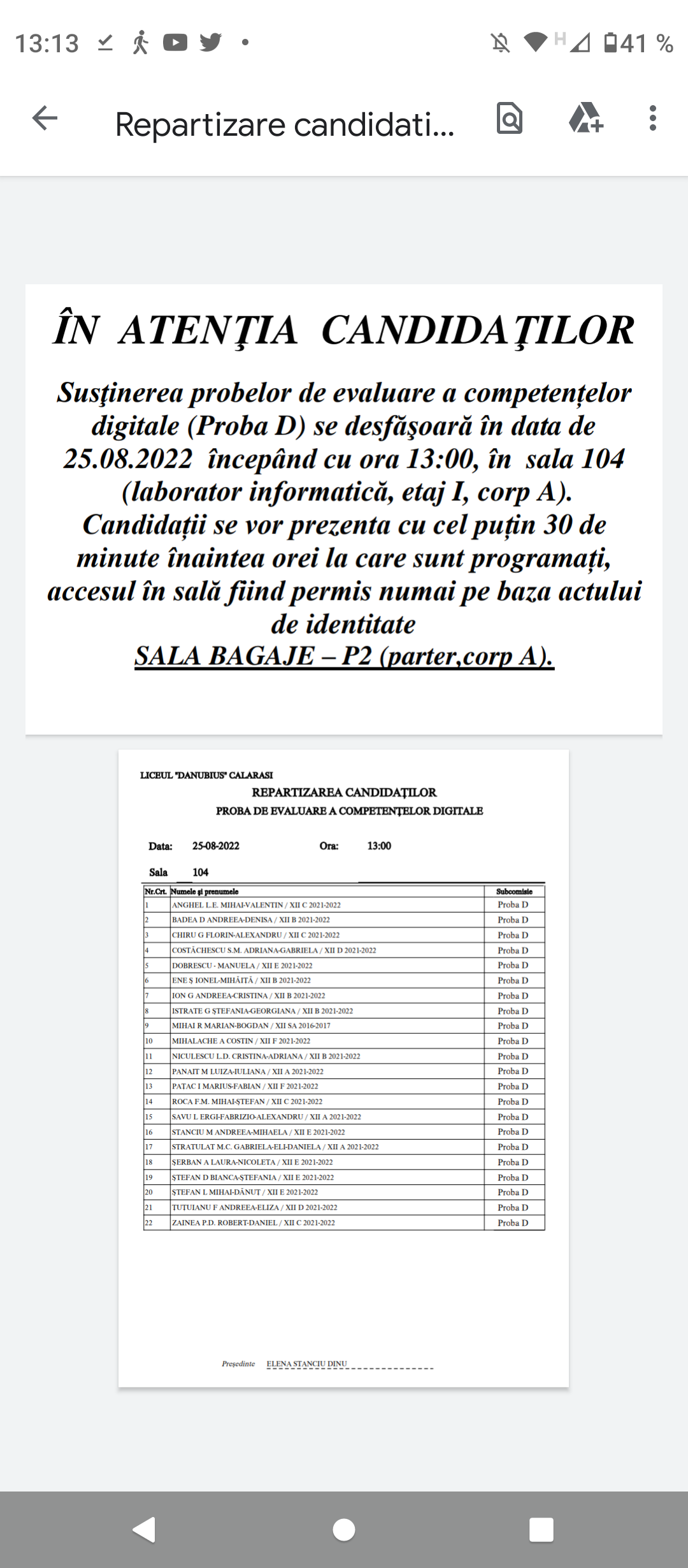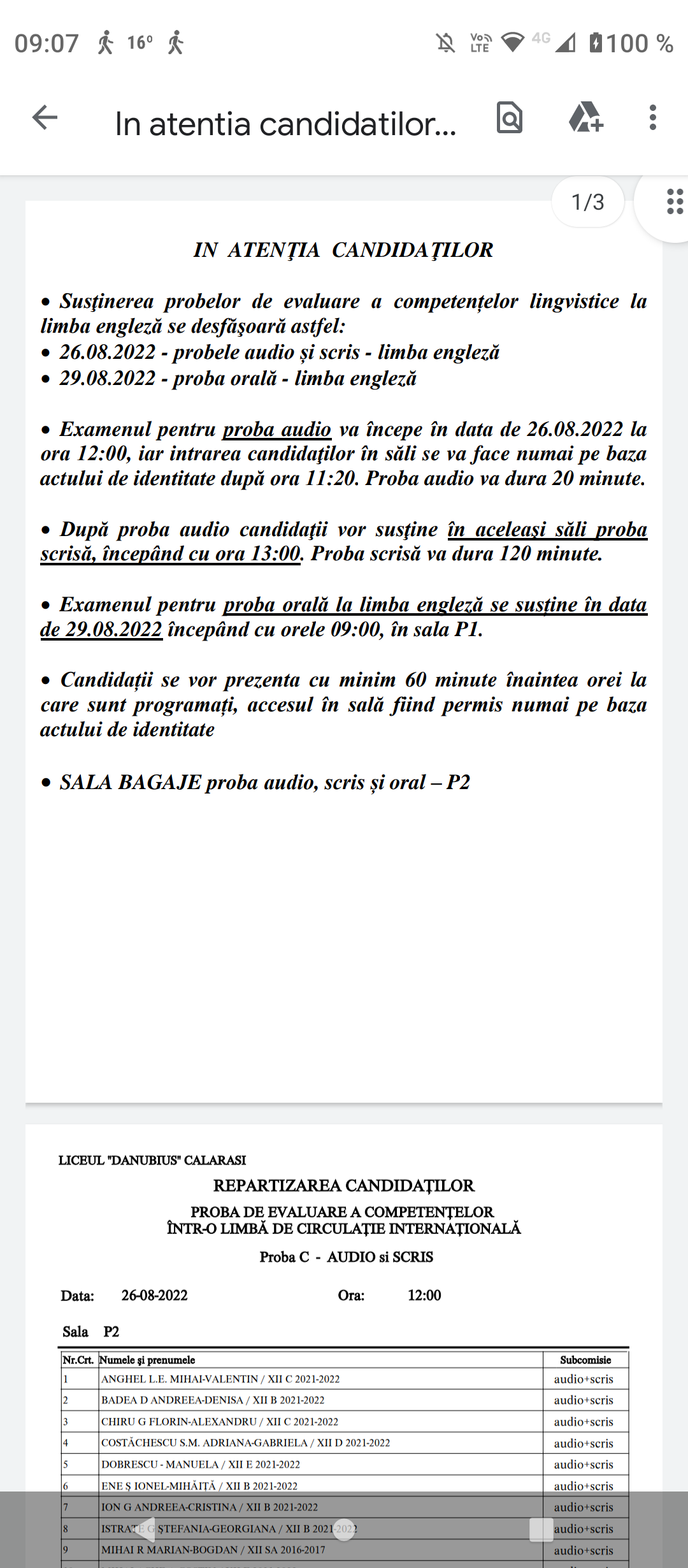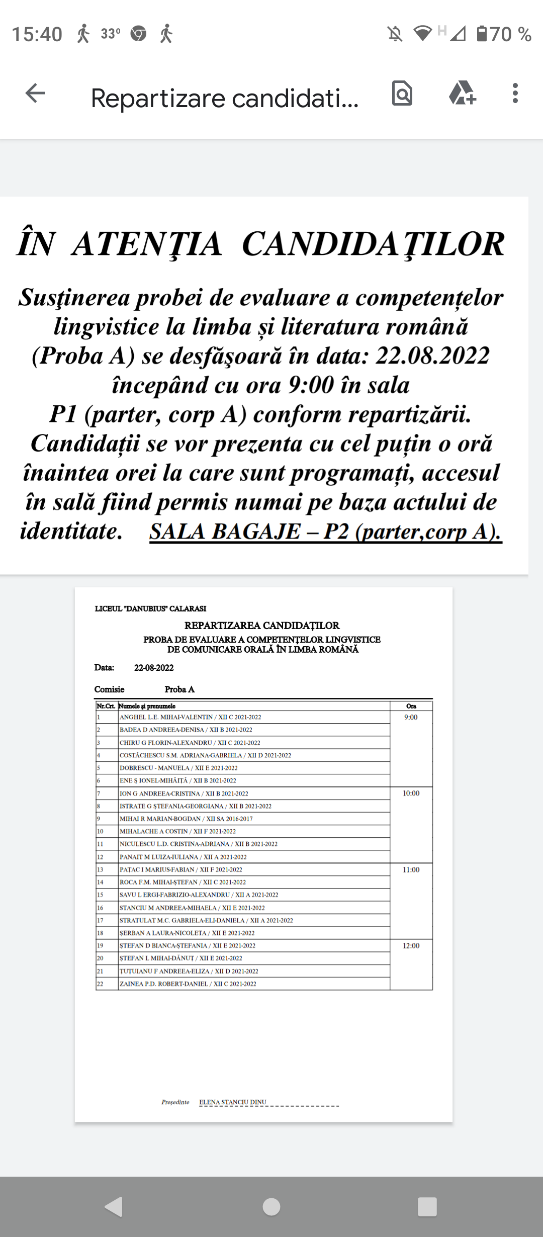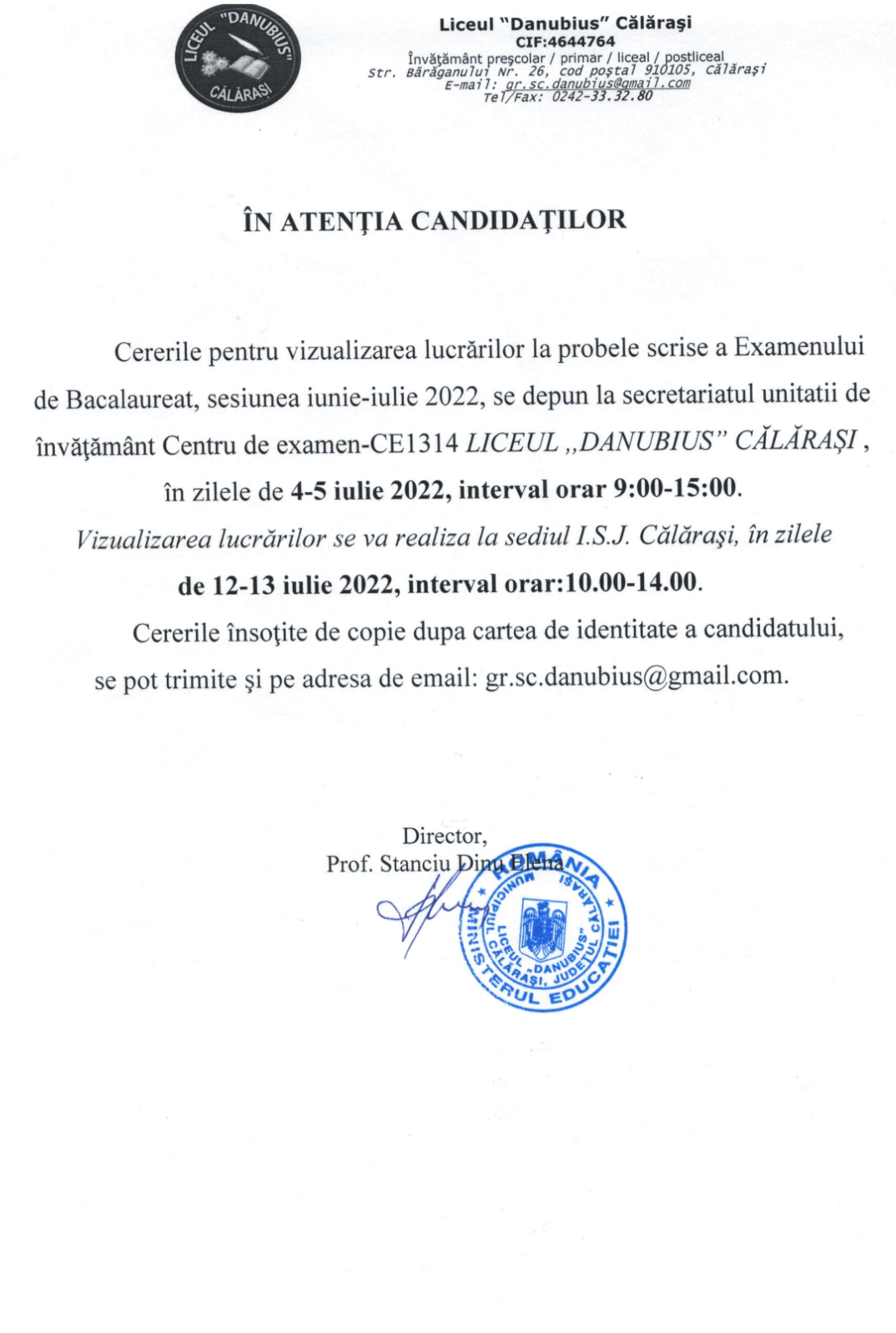 ÎN ATENȚIA CANDIDAȚILOR Afișarea rezultatelor la probele scrise va avea loc miercuri, 31.08.2022, până la orele 12:00. Contestațiile vor putea fi depuse miercuri, 31.08.2022, în intervalul orar 12:00 – 18:00. Formularul de contestație se găsește la comisie și pe site-ul liceului (https://danubius.info/), poate fi depus online, prin scanare, la adresa contestatiidanubius@gmail.com (1. formular contestație, 2. …